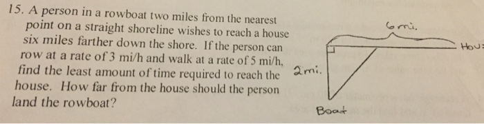 A person in a rowboat two miles from the nearest point on a straight shoreline wishes to reach a house six miles farther down the shore. If the person can row at a rate of eq3 mi/h/eq and walk ... 7 A person in a rowboat 2 miles from the nearest point on a straight shoreline wishes to reach a house 6 miles farther down the shore. If the person can row at a rate of 3 mi/hr and walk at a rate of 5mi/hr. find the least amount of time required to reach the house. Show all steps youand below are some pictures from various sources